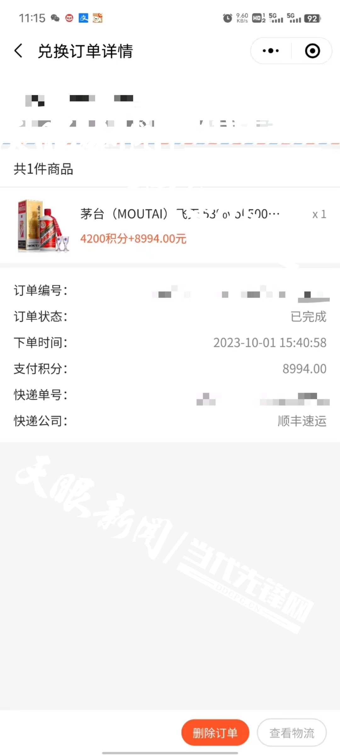 在朋友推荐下,沈先生分别于10月3日和10月8日在一款名叫“贵旅黔游”的小程序上购买了一些土特产,共计消费8555元。按小程序的积分规则,这笔钱可兑换8555分,用这些积分加8994元现金,可兑换一件飞天茅台酒。