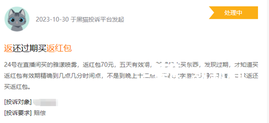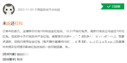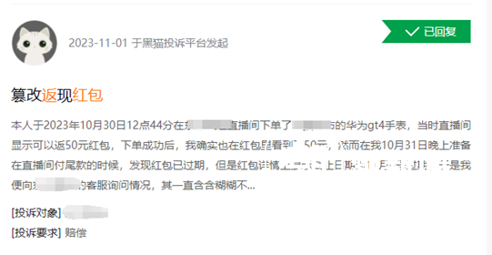 10月31日,据黑猫投诉发布消息,有多名消费者在其平台集体投诉称,某直播间主播宣传下单后会返还红包,该红包可以用来付尾款、买现货等。但在实际操作中,付尾款时间还未到,红包就已显示过期,导致网友出现损失。