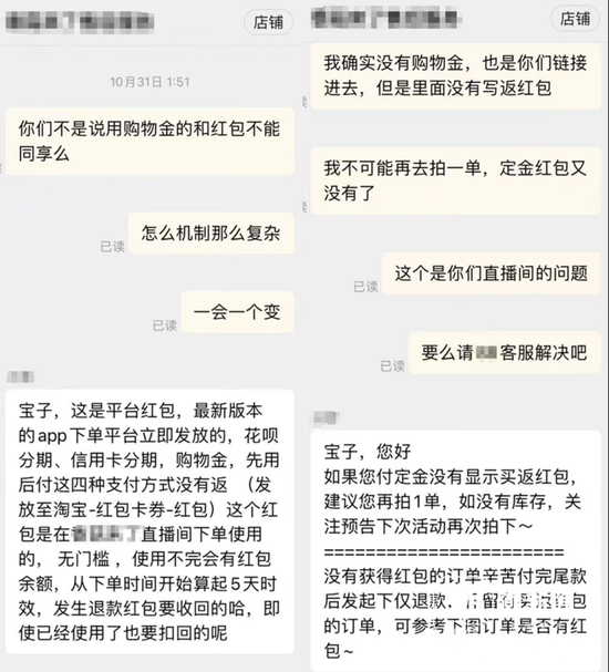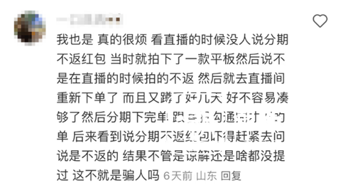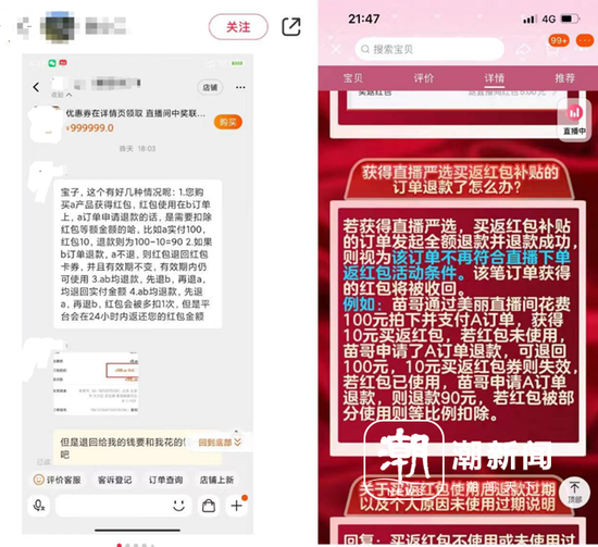 有网友总结,“买返红包”看似是实打实的优惠,若直播商品发起退货退款,到手的红包很有可能变成了“自费”。