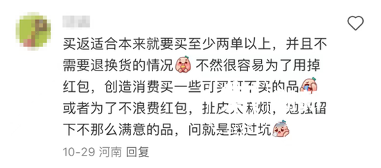 在社交平台上,有网友因为购买的是预售商品,5天内商品仍在运输途中,“红包有效期快到了,只能在未收到商品的情况下使用红包购买其他商品”“不断返不断用,冷静下来想退时,发现最有效的办法是全退,劝大家下单前一定要谨慎。”