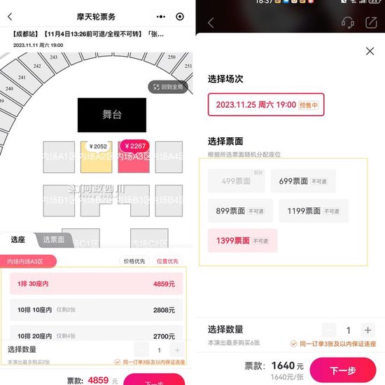 施露还在另一个票务App上发现,张信哲其他场次的演唱会门票无法选座,但成都场却能精确到几排几座,并明码标价,其中1排30座内的票价达到4859元。