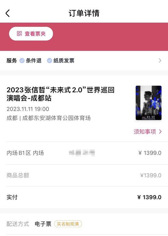 10月11日,施露在大麦App抢票成功,“当时内场就1399元和1099元两档价位,买到1399元的票,我觉得肯定是前排座位了。”施露回忆,在退票期限过后,她才收到官方公布的座位信息,内场分A、B、C三个区,其中最靠前的是A区,而她的座位在B1区,“因为我第一次在国内看演唱会,没有概念,后来到现场才知道自己被坑了。”