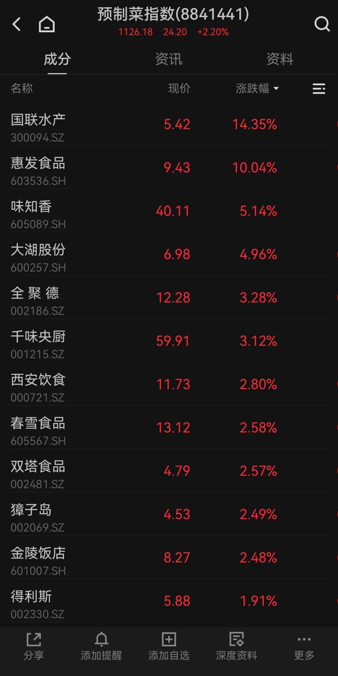 据Wind数据,截至24日收盘,A股预制菜概念板块整体上涨2.20%,资金净流入4.59亿元,其中国联水产上涨14.35%,惠发食品涨停,大湖股份、春雪食品、全聚德、味知香等个股纷纷跟涨。