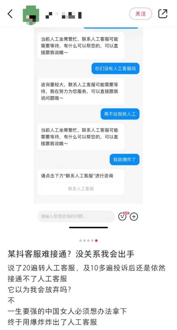 法治网记者注意到,随着各平台人工客服转接难度越来越大,还有不少网友开始分享自己探索出的成功接通人工客服的攻略。这些方法有的是介绍一些常规流程,有的则是试图用“魔法打败魔法”。例如无论AI客服说什么,用户始终复读机式地不断重复“人工客服”“投诉”等,或者发送“我要爆炸了”等情绪性话语来触发关键词“激”出人工客服。