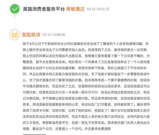 一家婚介企业前法务部总监王丹丹透露,近几年全国各地类似事件频发,被骗的消费者多为90后女性。“黑婚介的套路都很雷同,主要可以总结为几个步骤:线上转线下,线下哄骗签合约,合约签完哄骗相看几名嘉宾,然后在消费者要求退款时拒不接受。黑婚介主要靠赚取高额违约金谋利。”