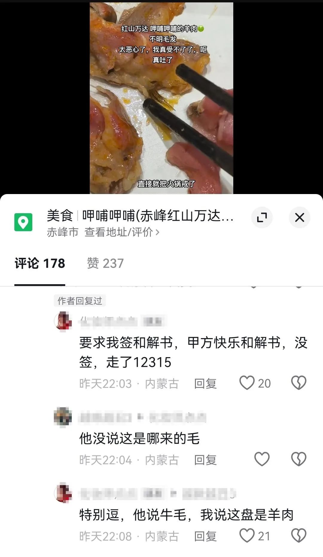 该女子在评论区里回复网友,门店要求她签和解书,但是她没有同意,向12315进行了投诉。“特别逗,他说是牛毛,我说这盘是羊肉。”