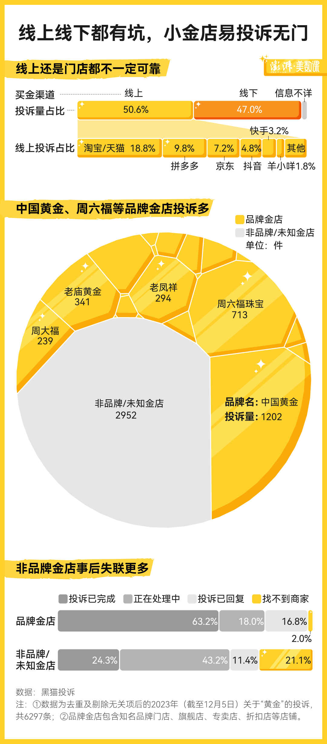 通过梳理黑猫投诉2023年所有关于“黄金”的消费纠纷,澎湃新闻发现无论是在网购还是线下,品牌店还是非品牌店,购买黄金都有可能踩坑。