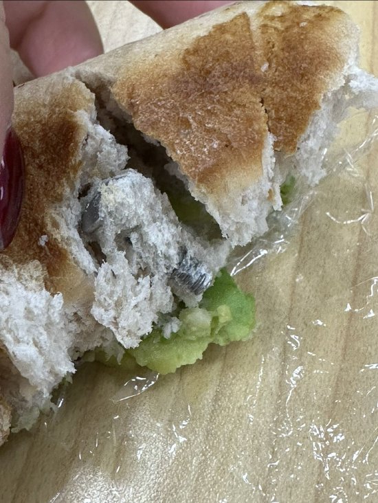 陕西西安的李女士告诉《5D调查》,自己12月22日在新兴广场盒马门店购买了蔓越莓贝果,自己切开夹了牛油果,“切的时候都没感觉,吃的时候突然觉得硬硬的,还把补的牙硌豁了一丢丢”。