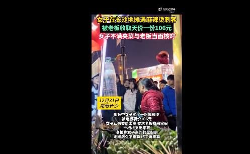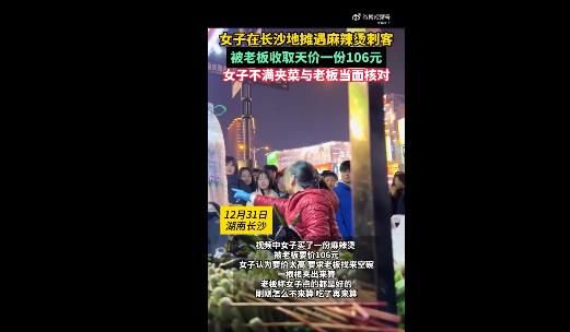 12月31日,湖南长沙,女子在地摊遇麻辣烫刺客被老板收取106元一份,女子不满夹菜与老板当面核对。