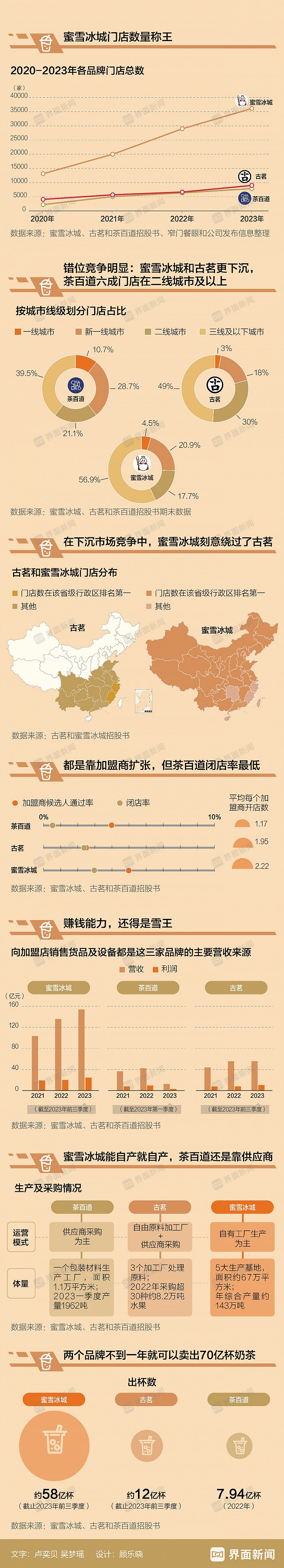 港交所即将涌现一波中国新茶饮品牌。1月2日,蜜雪冰城与古茗分别递交了港股上市申请招股书;2023年8月,茶百道也做出了同样的举动,同年12月21日,它的港股IPO于证监会备案通过。在他们招股书中,不仅仅透露出这三家公司的运营情况,也折射了当下中国茶饮市场的格局与发展路径。