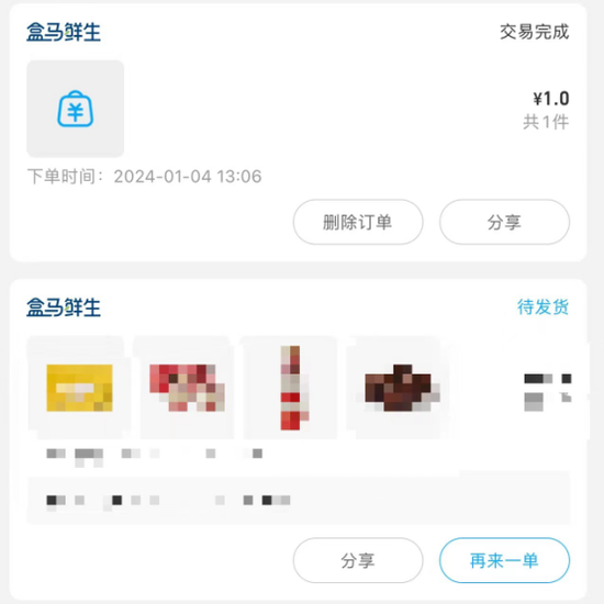 4日,法治网记者打开盒马线上App进行购物,发现在购物结束时突然生成一个1元包装费的订单。