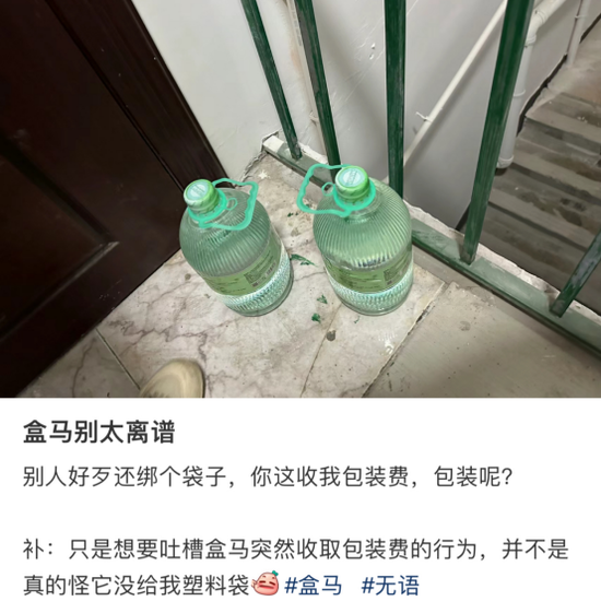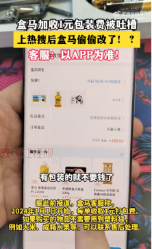 盒马App强制收取1元包装费,网友称买袋大米给了个小塑料袋