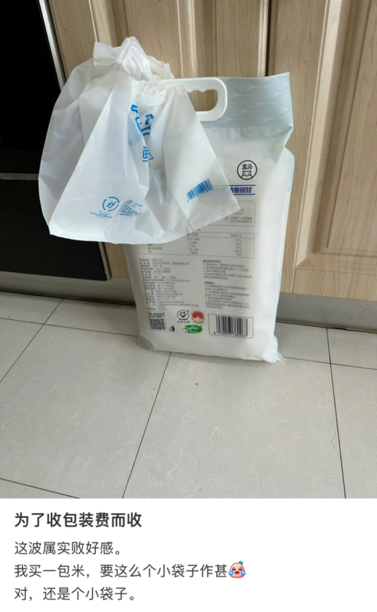 盒马此举看上去是响应国家“限塑令”的规定并无大碍,不过却有不少网友在互联网平台表示,这个规定下不管自己购买的东西需不需要包装,盒马都送来了塑料袋。一位网友还晒出了这样的一单——自己购买了一大袋大米,居然给了一个小塑料袋。还有网友表示,自己购买了两个桶装水,没有给包装袋,线上也收取了一元手续费。