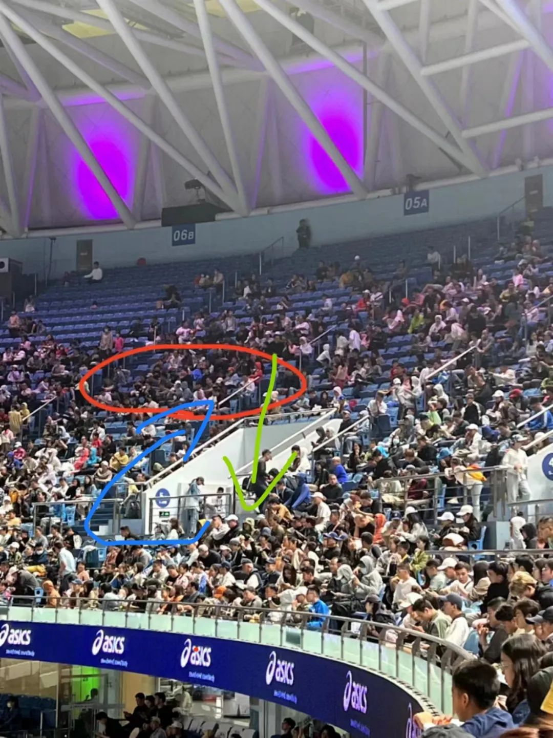实际从二层入口进入后,还需要十几级台阶,才能抵达吴女士的购票位置。吴女士提出,是否可以有志愿者帮忙?或者有轮椅观赛区?客服仍然重复不清楚,你自己想办法吧。