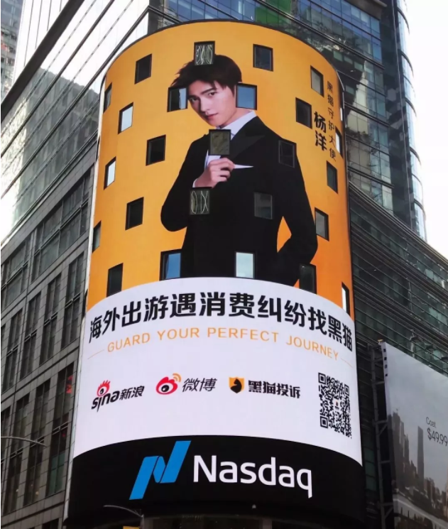 今年10月14日,黑猫投诉携手黑猫守护大使@杨洋 登陆美国纽约时代广场的纳斯达克大屏,在世界舞台上亮相,只为守护你的消费权益,一起传递消费维权正能量。