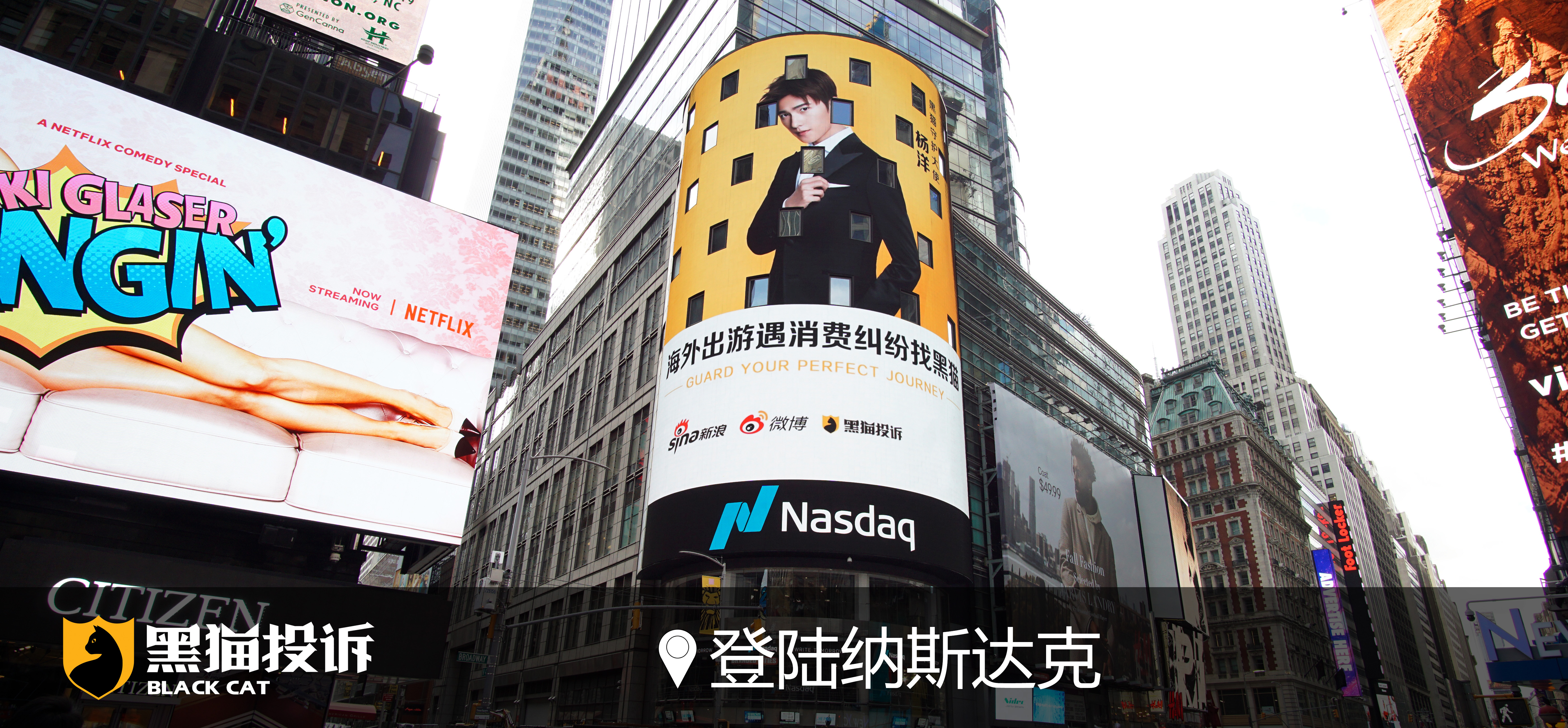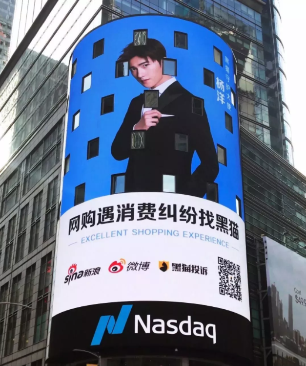 黑猫投诉携手杨洋登陆纳斯达克大屏