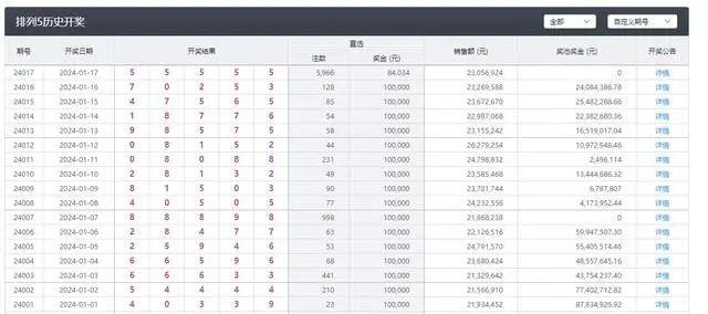 该期“排列5”全国销售金额23,056,924元,一等奖中奖注数井喷,有5966注,单注奖金84034元,应派奖金合计501,346,844元。该期开奖公告称:“0.00元奖金滚入下期奖池”,意味着奖池被清零。