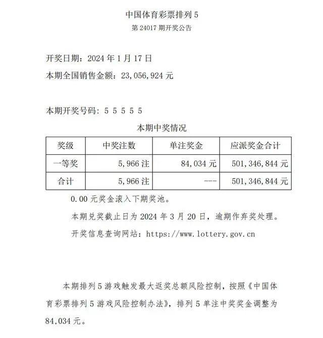 且该期排列 5 游戏触发最大返奖总额风险控制,按照《中国体育彩票排列5游戏风险控制办法》,排列5单注中奖奖金调整为84,034 元。