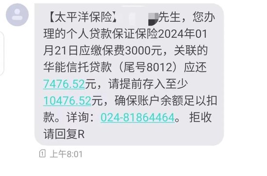 还款短信显示,郑先生办理的个人贷款保证保险应缴保费为3000元,关联的华能信托贷款为7476.52元,即每期合计需还款10476.52元。截至目前,郑先生已还款25万元,但仍需还款12期。郑先生认为该笔保费推高其贷款成本,涉嫌超出年化利率36%的监管红线。日前,郑先生向太平洋产险进行投诉,要求返还息费。太平洋产险工作人员则回复称,保费是保费,利息是利息,并无重合之处。