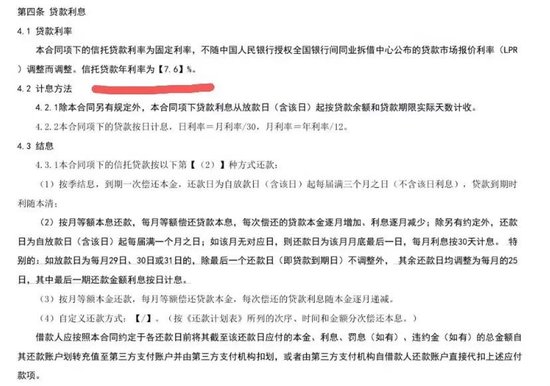 用户郑先生向记者反映称,2022年1月,其因资金周转紧张产生借贷需求,在太平洋财险一位业务员的推介下申请了一笔24万元的贷款,放款方为华能贵诚信托有限公司(以下简称“华能信托”)。据贷款合同显示,该笔贷款为信托贷款,贷款年化利率为7.6%,采取按月等额本息还款,分36期还清。表面上看,该笔贷款年化利率为7.6%,与普通贷款并无两样。值得注意的是,郑先生还与太平洋产险签订了一份个人贷款保证保险合同。
