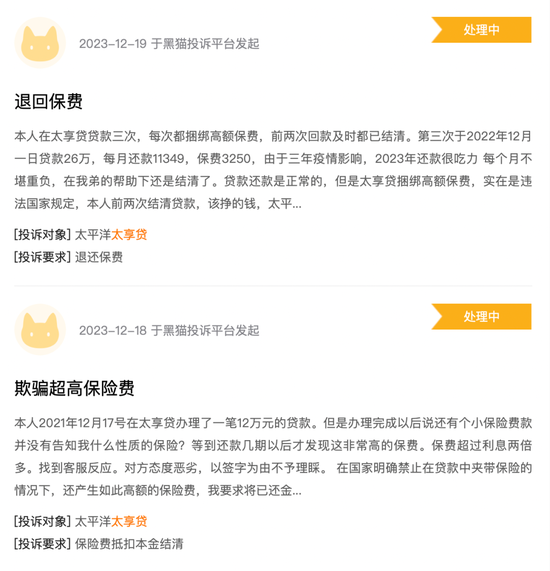 记者在黑猫投诉平台上以“太享贷”为关键词进行搜索,仍有不少用户投诉称,在还款时发现需支付太平洋产险的保费,其在不知情的情况下被搭售保险,质疑保费推高其综合贷款成本。