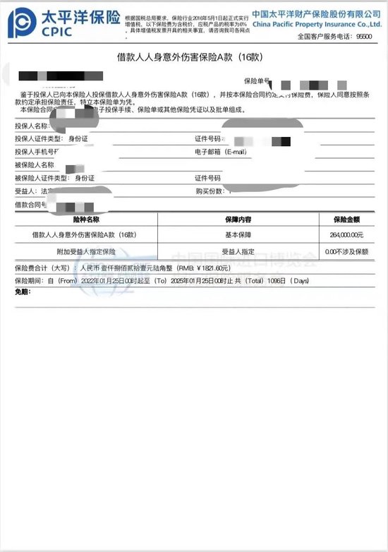 郑先生还向记者表示,其通过太平洋产险办理贷款时,除投保了一份个人贷款保证保险外,还被强制搭售了一份借款人人身意外伤害保险A款,保费金额为1821.6元,实际上本人并没有相关的投保需求。