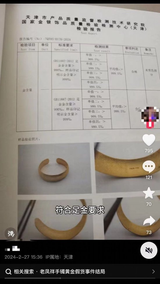 老凤祥回应“清洗金手镯蹭掉logo”:经检测产品质量合格