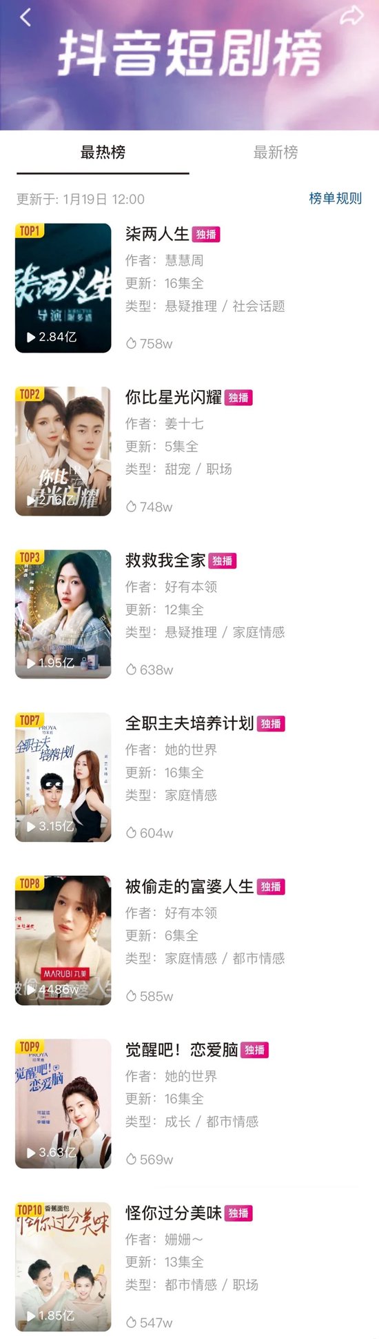 在抖音需要用关键词“短剧”搜索,跳转至“抖音短剧”频道,并看到按热度值自动生成的榜单。抖音的短剧热度值是由播放量、互动量综合计算得出。