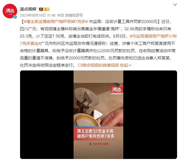 据黑猫大数据中心统计,2023年黑猫投诉上“缺斤少两”相关投诉超4000条,突出问题包含:生鲜零售市场“鬼秤”隐蔽不易察觉;网上购物虚假宣传缺斤少两;贵重物品变现遭“鬼秤”。从线下到线上,从生鲜到熟食,从路边摊到品牌店,都存在不同套路、不同程度的缺斤少两现象,“鬼秤”(做了手脚的电子秤)隐藏其间。在社交平台上,也有大量消费者反映网购缺斤少两问题,极端情况有“买了4斤糖果,到手发现只有1.5斤”、“下单两斤野菜,到手只有一半重量”等。还有博主曝光自己卖金镯被商户鬼秤吞掉7克多,投诉后,当地市监局没收“鬼秤”并对该商户罚款处罚。