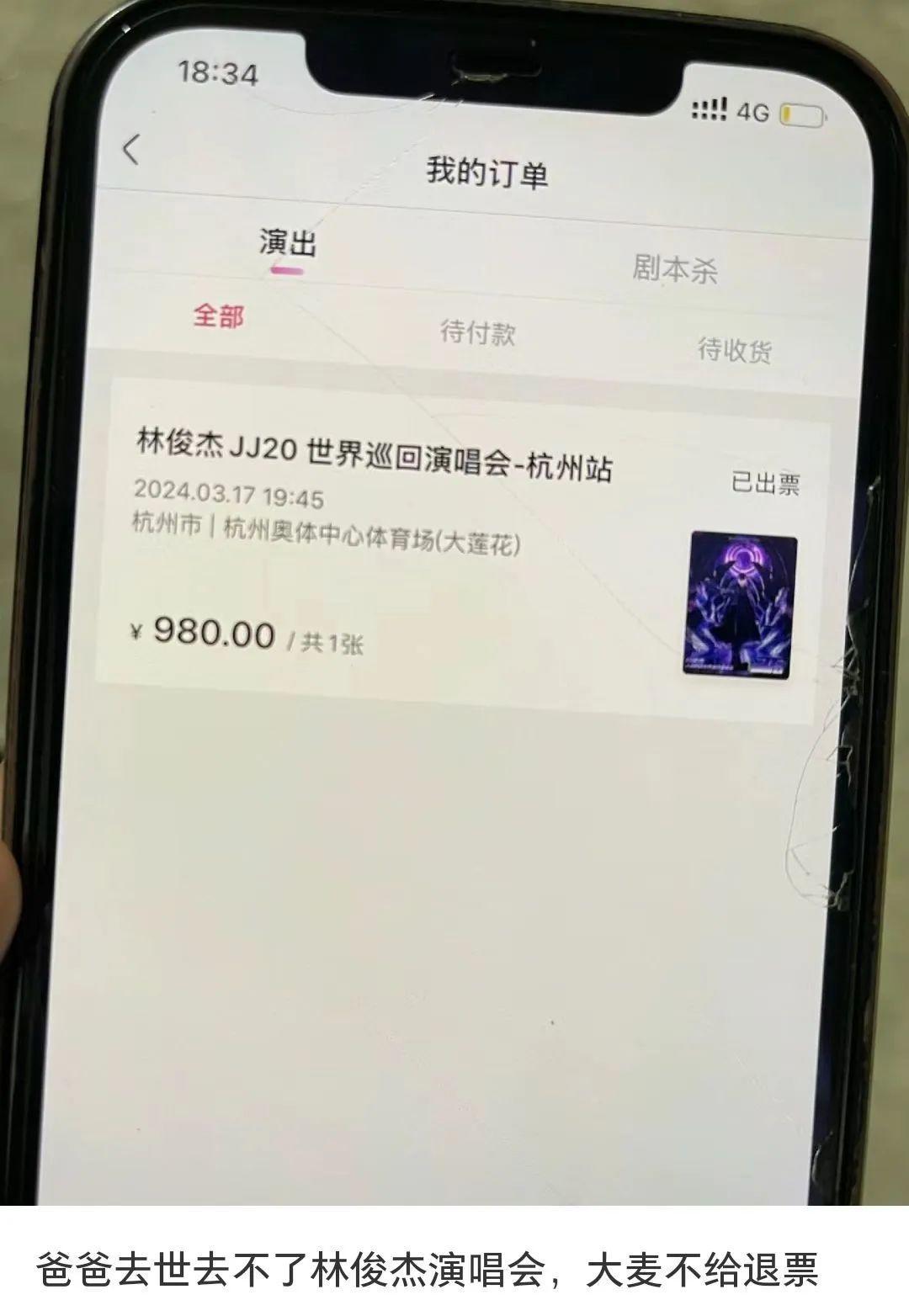 “机票酒店都退得很爽快,就是卡在了大麦。”据娟女士介绍,她的父亲在3月突然去世,大麦平台抢到的林俊杰杭州站门票是3月17日的,因为要专心为父亲处理身后事,再加上强实名制门票无法转卖,她便提前向大麦提出了退票申请。