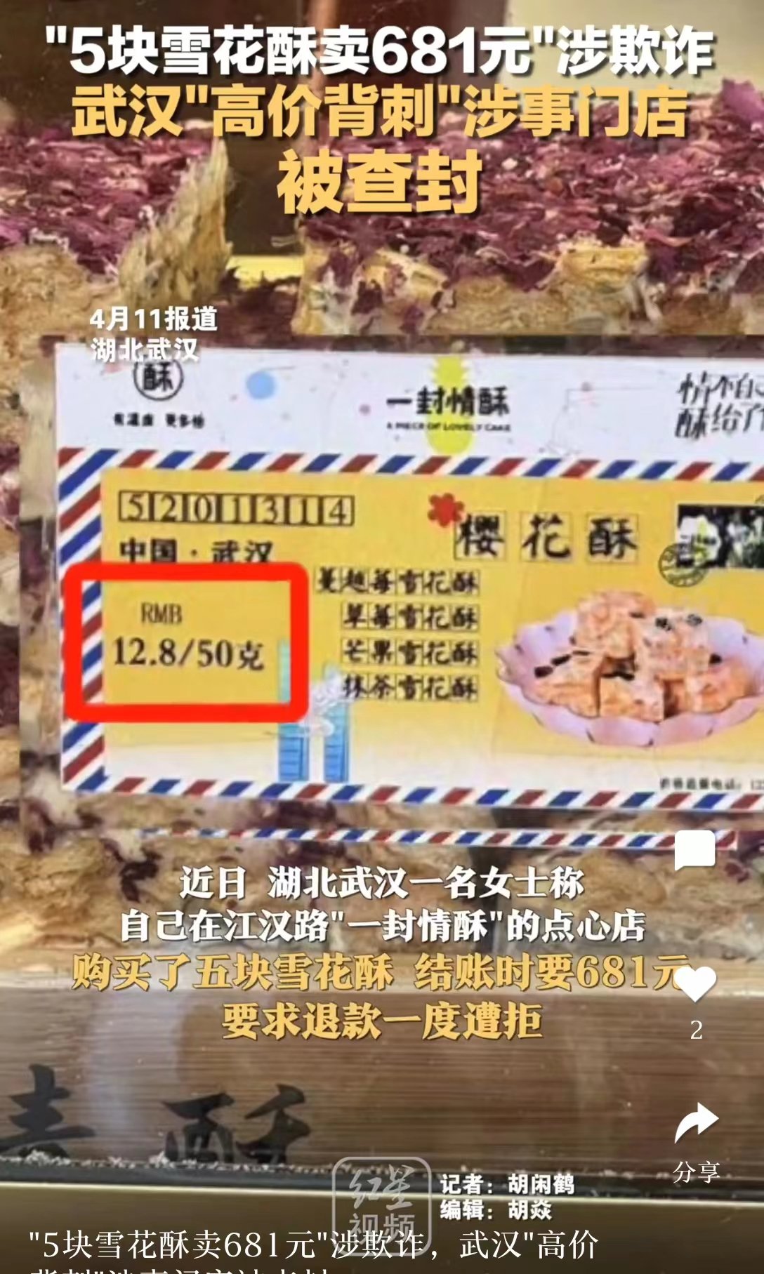 5块雪花酥花681元,武汉“高价背刺”涉事门店被查!