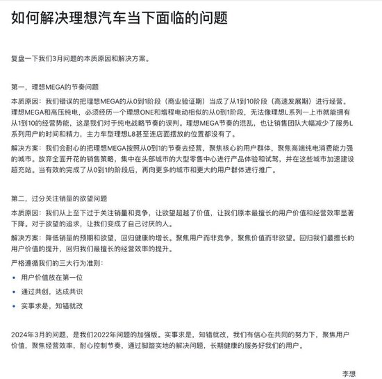 3月21日,理想汽车CEO李想发布全员信,李想反思了自3月初理想MEGA上市以来遇到的一系列问题。