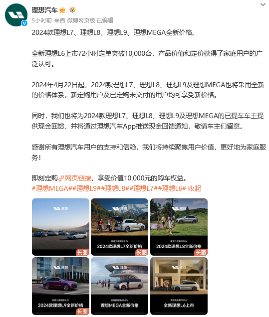 22日早上,理想汽车官方公布了全线产品降价消息。同时,理想汽车还宣布将为2024款理想L7、理想L8、理想L9及理想MEGA的已提车车主提供现金回馈。