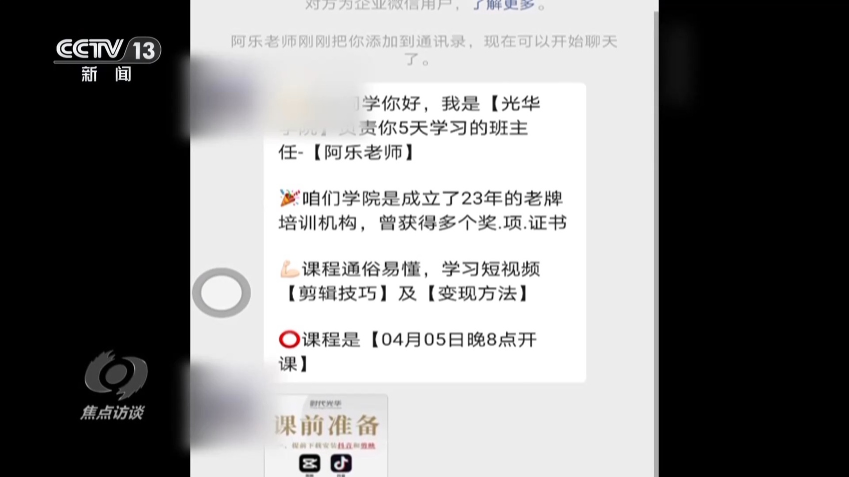 黄先生的遭遇并不是个案。记者浏览多个网络平台,发现类似的广告比比皆是,五花八门,0元学配音、0元学书法、0元学易经……记者随机点开了一家账号主体为北京时代光华科技有限公司的0元5天剪辑直播课,添加所谓的老师微信之后就被拉进了一个微信群,4月5日晚上8点,课程开始了。