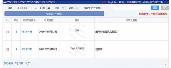 国家知识产权局商标局中国商标网显示,商标“亮赢”于2019年10月22日注册,注册人为盖州市信通饮品制造厂。据达利园公司相关负责人,该公司为盖州信通的委托商,其出示的央视广告播出证明材料显示,盖州信通的亮赢品牌广告,于2023年6、7月在CCTV7、CCTV17荣誉播出。