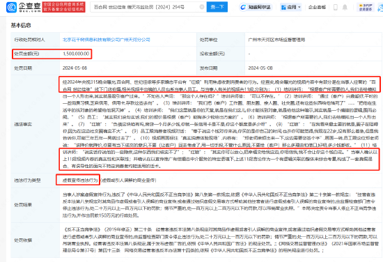 据企查查APP显示,近日,北京花千树信息科技有限公司广州天河分公司因虚假宣传违法行为,被广州市天河区市场监督管理局罚款150万元。
