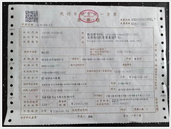 4月3日,按照销售人员发来的交车地址,钟先生来到阿维塔机场路店,即“阿维塔(重庆)汽车销售服务有限公司成都高新区分公司”注册地“火车南站西路865号”,完成提车。发票上的销售单位也是阿维塔成都高新区分公司,地址为“火车南站西路865号”。