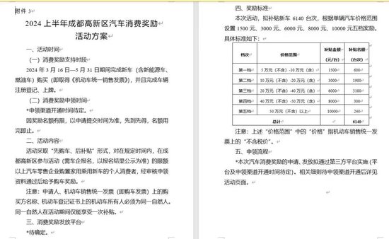 钟先生告诉记者,4月1日,销售人员给他发来一份《2024上半年高新区汽车消费奖励活动方案》,按照该方案,他购车的价格属于“第三档”,可以申领补贴6000元。“活动方案没有盖章,并不是官方正式通知,相当于草稿,意思是他们报名参加了活动,只是正式方案还没有公布。”钟先生说。