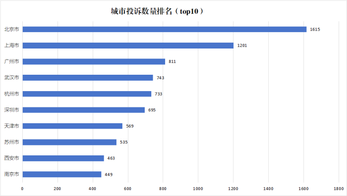按照投诉用户所属地市进行统计,投诉数量排名前十位的城市投诉总量为7814例,占投诉总量的33.51%。北京市和上海市在投诉用户常驻城市中占比领先,分别为7%和5.15%。广州和深圳作为广东省的代表城市,也有较高的投诉用户占比,分别为3.48%和3.19%。武汉、杭州、天津、苏州、西安和南京等城市进入top10,表明这些城市的消费者维权意识较强。