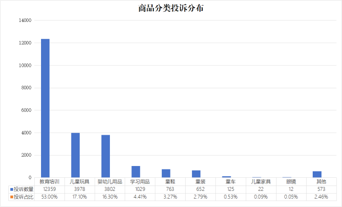在本次投诉数据统计中,针对儿童消费市场的投诉涉及多个商品和服务品类,包括教育培训、儿童玩具、婴幼儿用品、学习用品、童鞋、童装、童车、儿童家具、眼镜及其他等。
