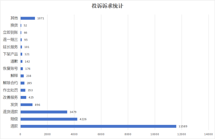 投诉数据显示,消费者的投诉诉求主要分为以下几类:退款、赔偿、退货退款、发货、改善服务、作出处罚、解除合约、解释、恢复账号、道歉、下架产品、延长服务、退一赔三、立即到账、换货,及其他要求等。如下图所示。