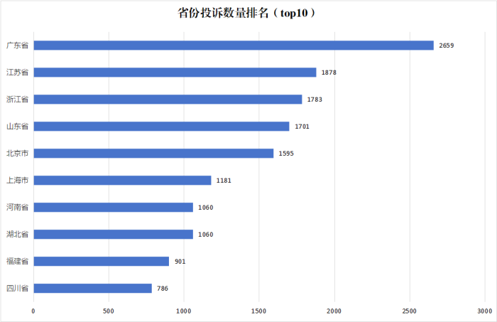 按照投诉用户所属省份进行统计,投诉数量排名前十位的省份投诉总量为14604例,占投诉总量的62.64%。广东、江苏、浙江、山东的投诉案例数量位居前四,一方面印证了这些省份人口较多、经济发达、消费活跃,另一方面也反映出这些省份的消费者具有较强的消费者维权意识。