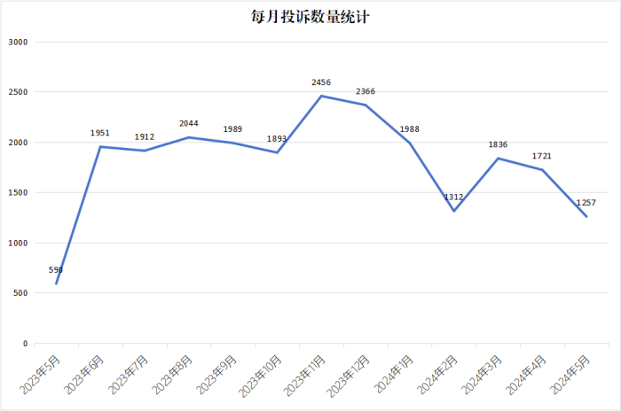 2023年5月23日至2024年5月22日期间,儿童消费市场月度投诉分布如下图所示: