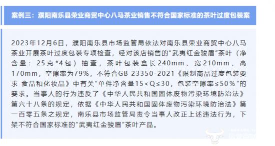 据了解,该案例具体发生在去年12月6日,当时濮阳南乐县市场监管局依法对南乐县荣业商贸中心八马茶业开展茶叶过度包装专项检查,发现该店销售的“武夷红金骏眉”茶叶空隙率为79%,不符合GB 23350-2021《限制商品过度包装要求 食品和化妆品》中有关“单件净含量15