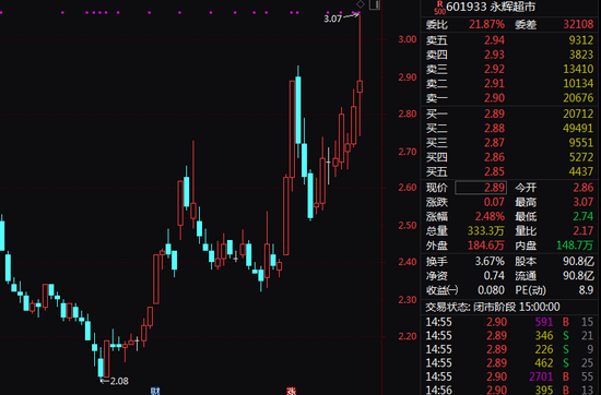 下午开盘永辉超市股价暴涨,一度超过8%,收盘上涨2.48%。