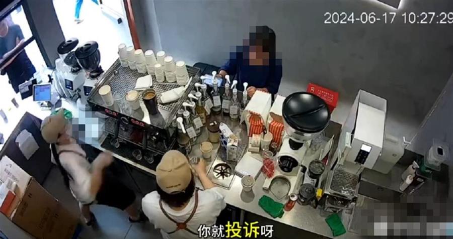 一段咖啡店内的监控视频显示,一名女店员突然情绪失控,对着一女顾客冲顾客大喊“你投诉啊”,并将一杯粉状物泼向对方,致使女顾客面部被粉状物糊满。监控视频位置显示为“威海路716号门店”,事发时间为2024年6月17日。