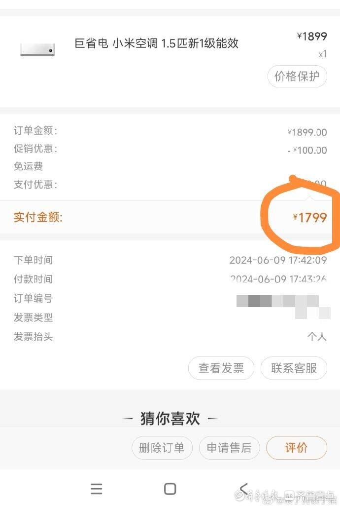 “今年一直想装台空调,就一直在网上关注,想着6·18肯定有优惠,5月26日,我在米家APP上看到一款小米巨省电1.5匹空调原价2599元,促销价1899元,还有100元券,实际支付只要1799元,感觉比较划算,另外商家还提供30天价保服务。”赵先生反映,价保服务从5月26日一直到6月25日,他以为6·18的优惠也就这些了,就果断下了单。