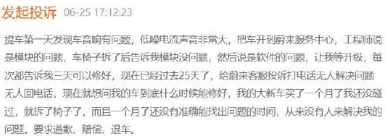 “每次都告诉我三天可以修好,现在已经过去25天了,给蔚来客服投诉打电话无人解决问题无人回电话,现在就想问我的车到底什么时候能修好,我的大新车买了一个月了我还没碰过,就拆了椅子,而且一个月了还没有准确能找出问题的时间”,王女士吐槽道。