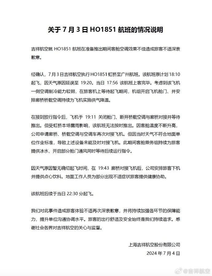7月4日晚,吉祥航空发布情况说明,就HO1851航班在准备推出期间客舱空调效果不佳造成旅客不适深表歉意。