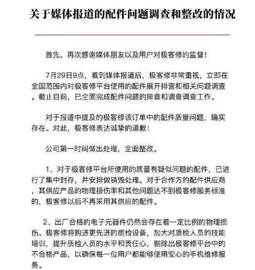 7月30日,“极客修”发布声明,称已全面完成配件问题的排查和调查工作。其中特别说明:“对于极客修平台所使用的质量有疑似问题的配件,已进行了集中封存,并安排做销毁处理。”